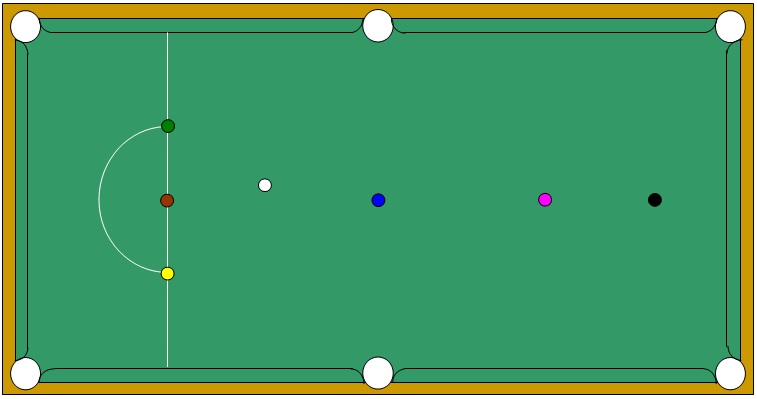 Starting with the yellow clear the colours in sequence, potting each colour into the same top corner pocket.