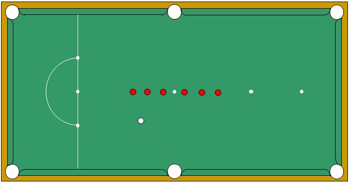Line six reds two balls’ widths apart with the blue spot splitting them in half.